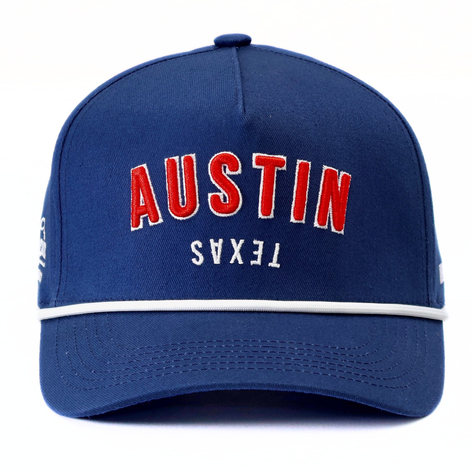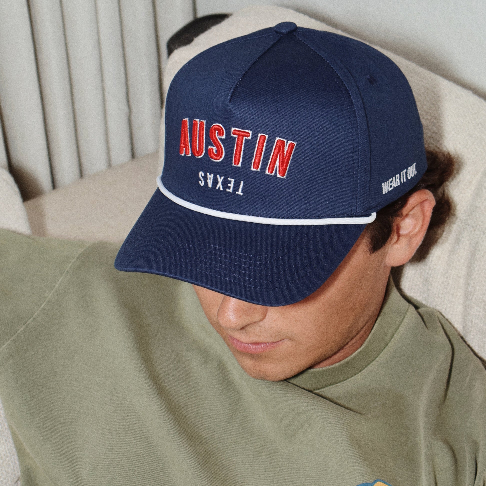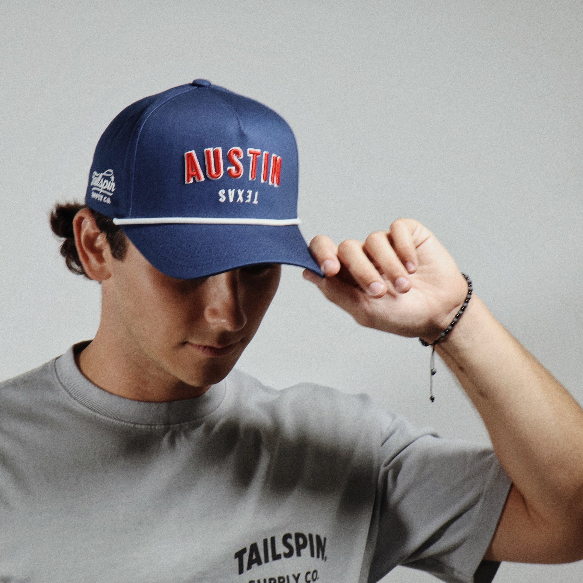 A bold nod to the Lone Star capital. The Austin Texas Rope Hat from Tailspin Supply Co. blends classic varsity vibes with modern edge. Featuring bright red puff-embroidered “AUSTIN” lettering and a clean inverted “TEXAS” below, this cap makes a statement from every angle. The white rope detail across the brim adds a vintage athletic touch, while the navy base keeps it timeless.