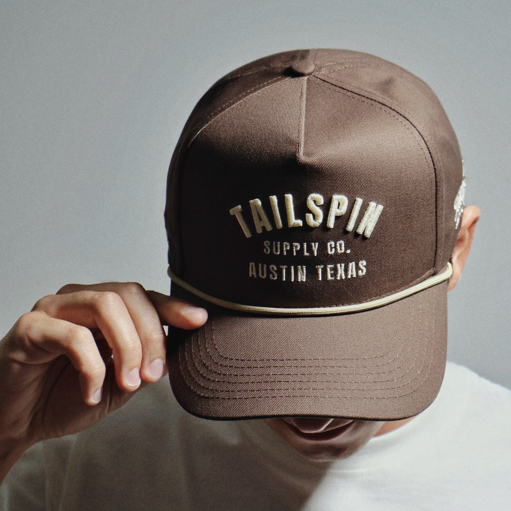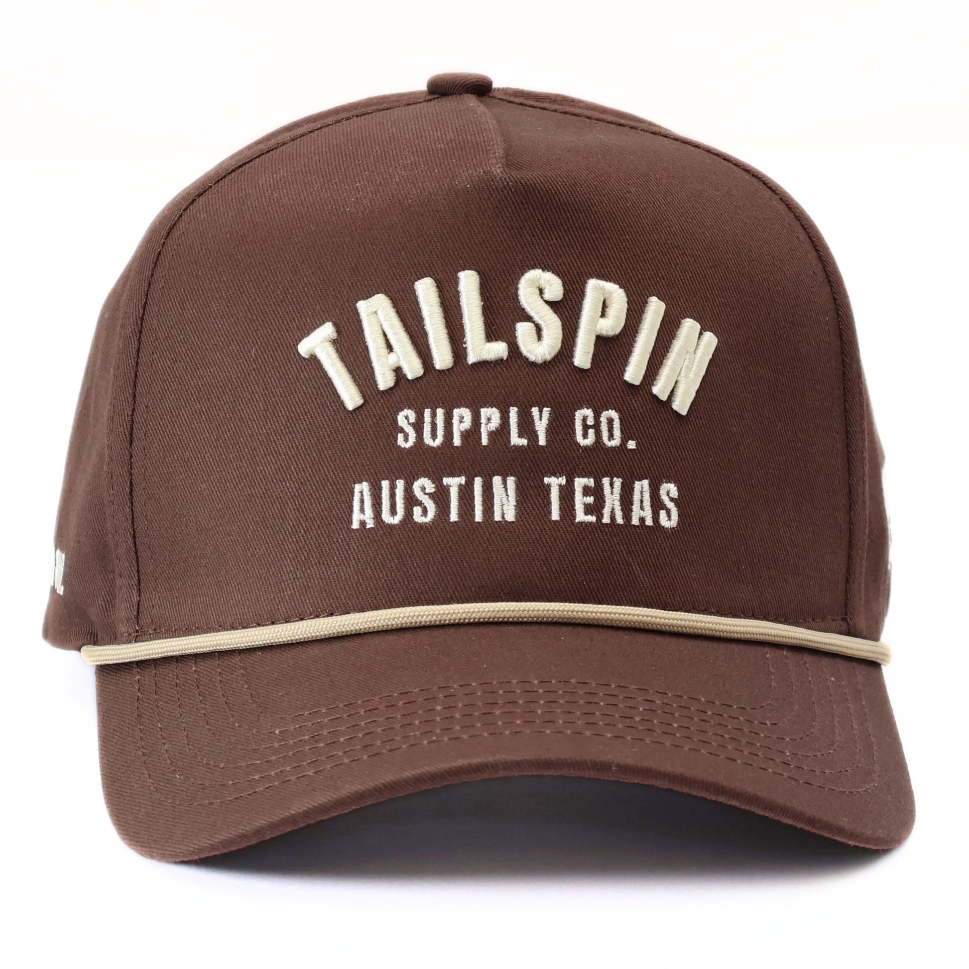 A clean classic with Western grit. This deep brown 5-panel rope hat features cream puff-embroidered “TAILSPIN SUPPLY CO.” text arched over “AUSTIN TEXAS.” With its retro rope trim and structured crown, it’s built for those who wear it out.