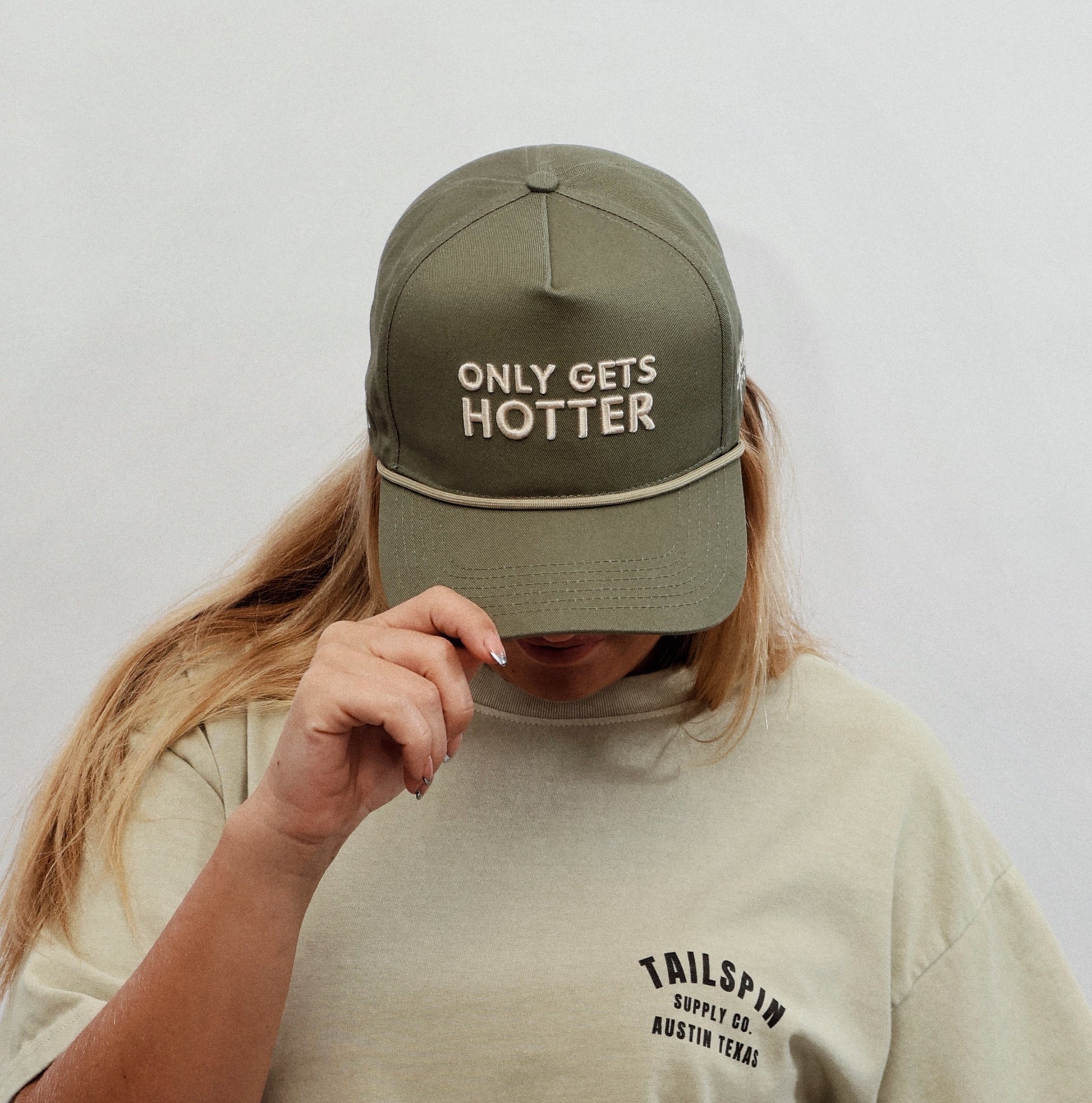 Just like Texas weather — this one only gets hotter. The olive green rope hat features bold puff-embroidered text in warm cream, delivering a perfect mix of humor and heat. Finished with vintage rope trim and Tailspin hits on the side.