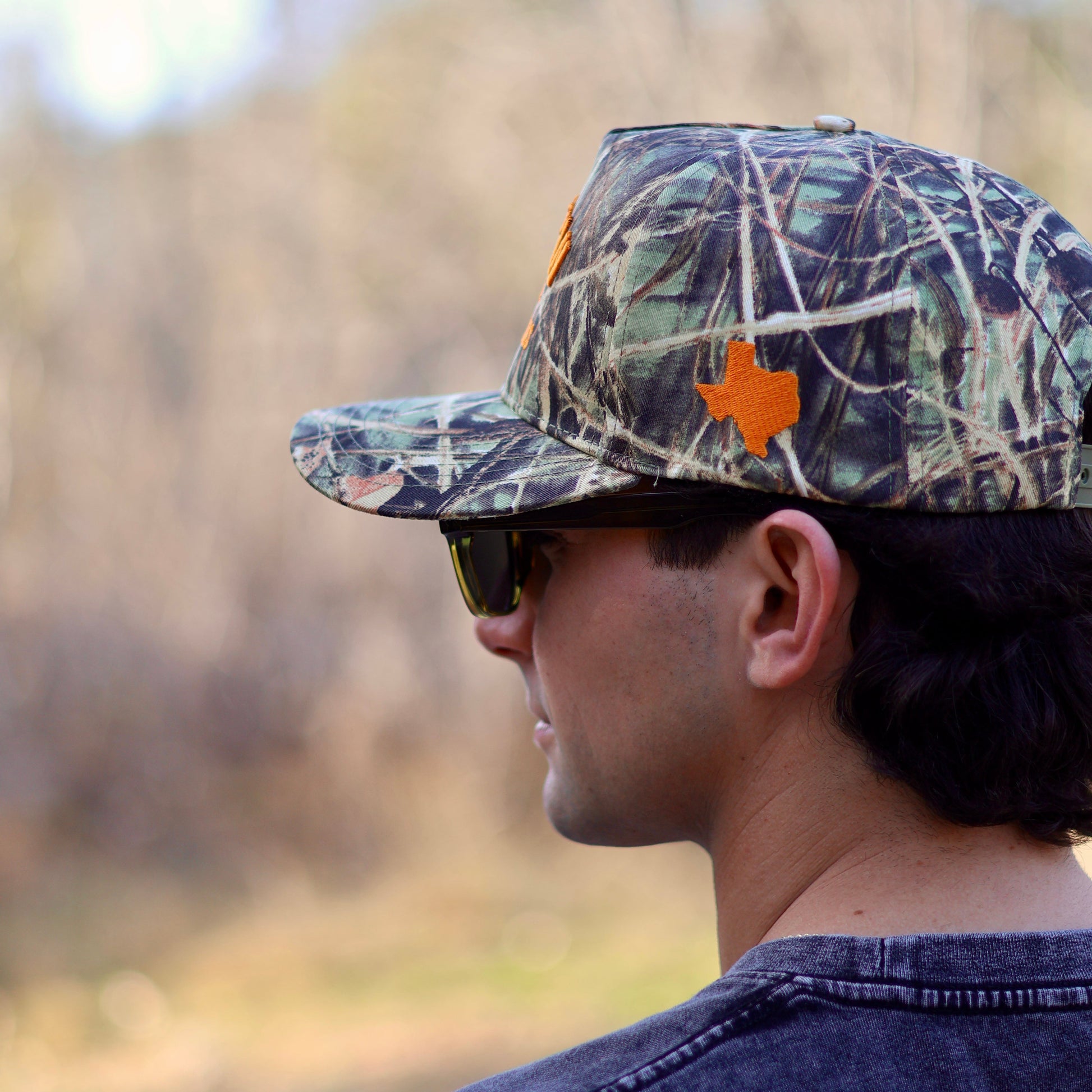 Structured 5-panel camo cap designed for everyday wear and long days outside. Built on a high-profile silhouette with a curved brim and snapback closure. Finished with bold orange embroidery on the front and a Texas silhouette hit on the side.